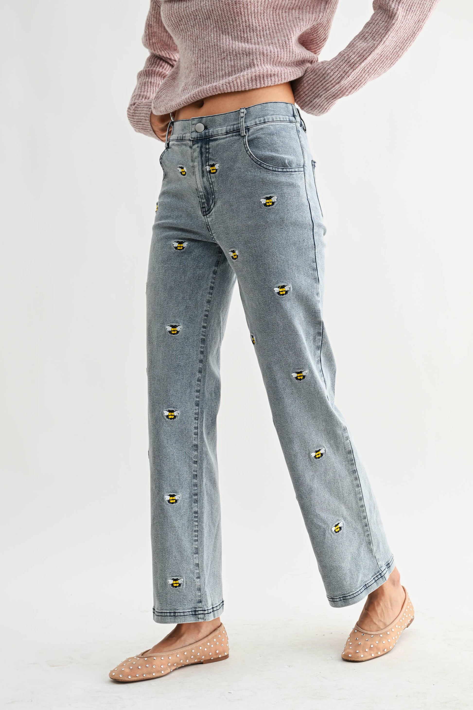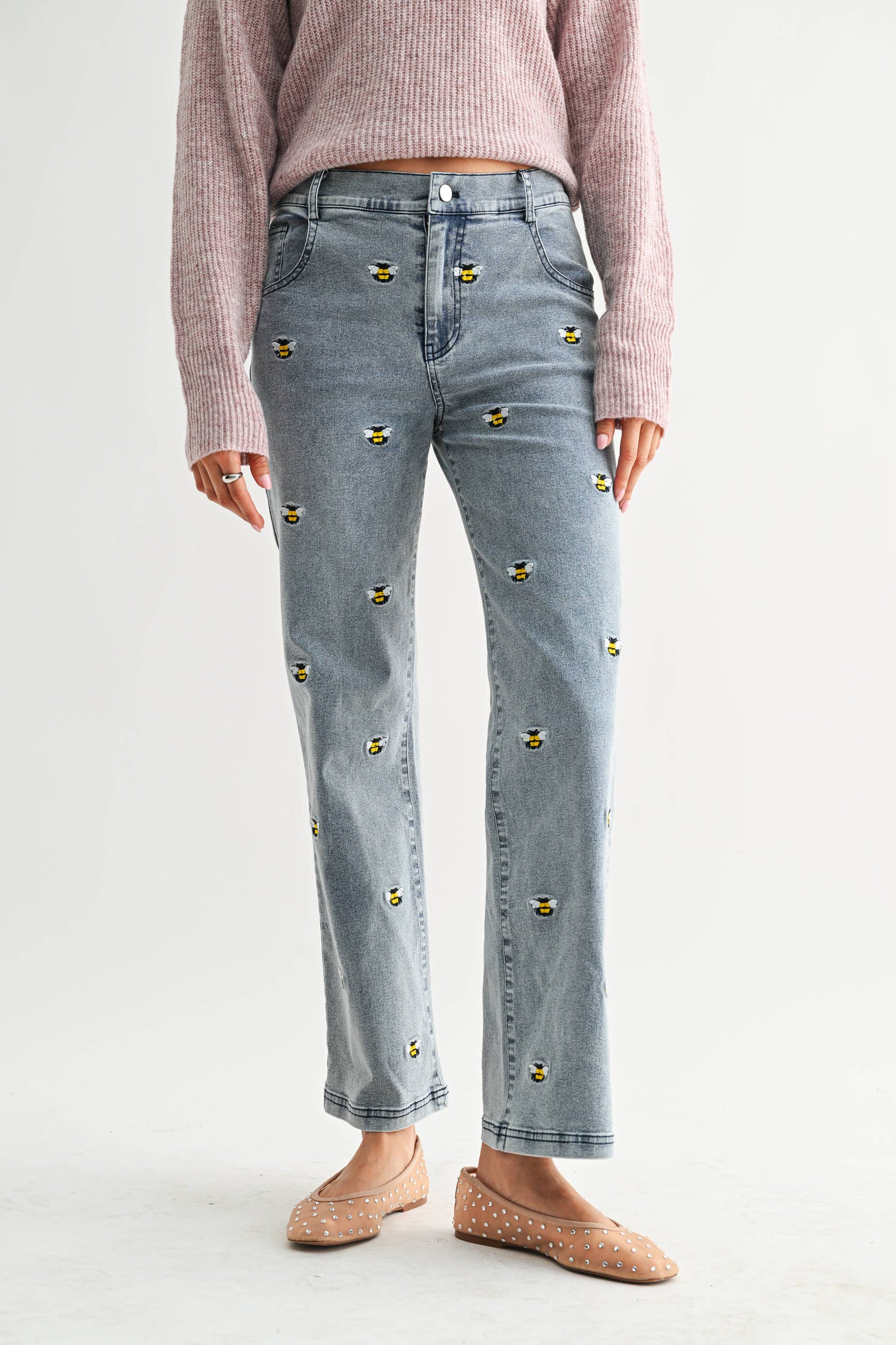 Add a playful twist to your denim collection with the Bee Happy Embroidered Straight-Leg Jeans. Featuring cute and colorful bee embroidery throughout, these light-wash jeans offer a relaxed fit with a mid-rise waist for all-day comfort. Perfect for pairing with cozy sweaters or casual tees, they bring a fun, whimsical vibe to any outfit while keeping it effortlessly chic.