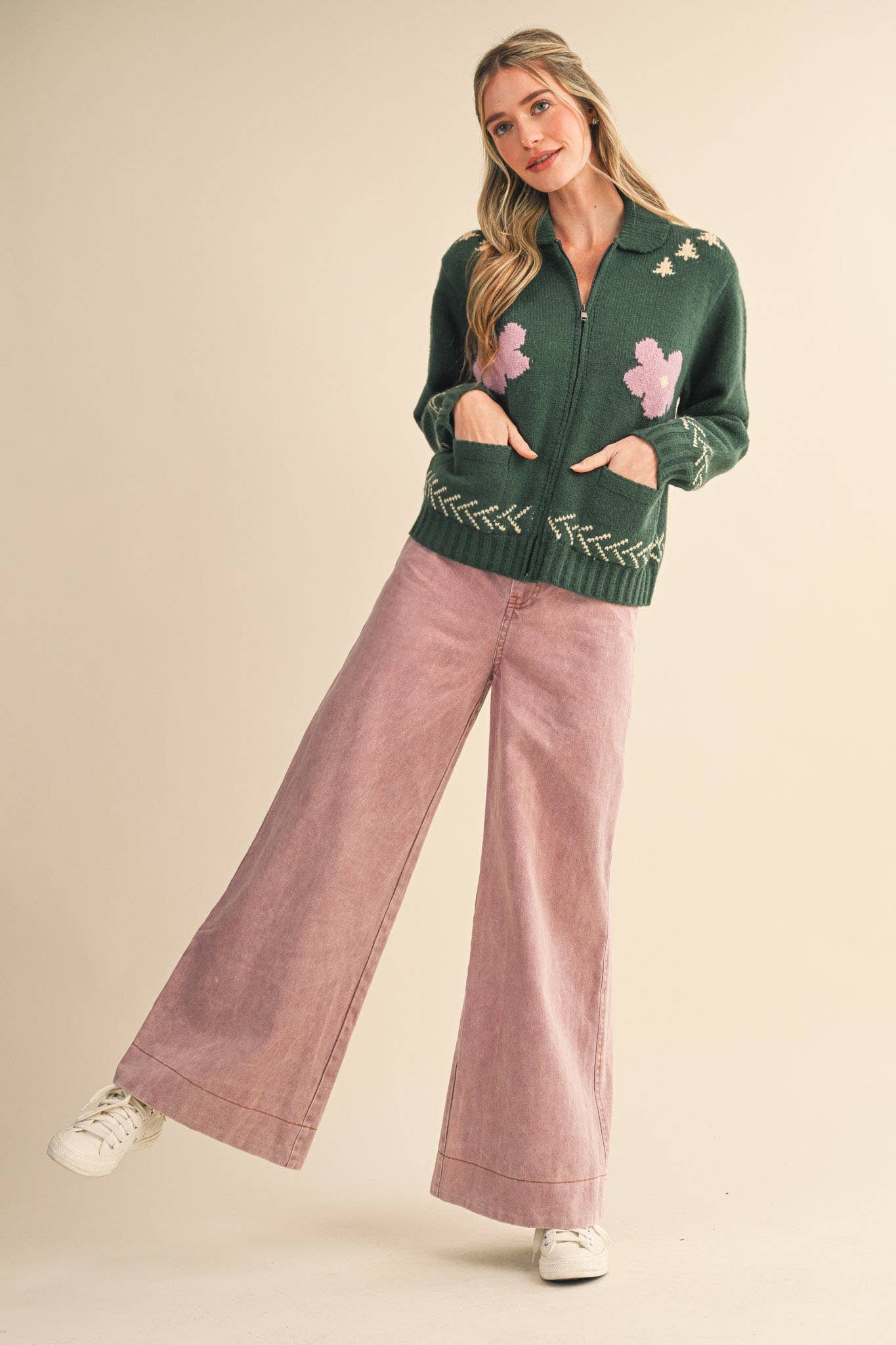 Braided pockets high waist wide leg pants + Zip up front with button closure + High rise waist + Seam detail on waist + Back pockets + Wide legs