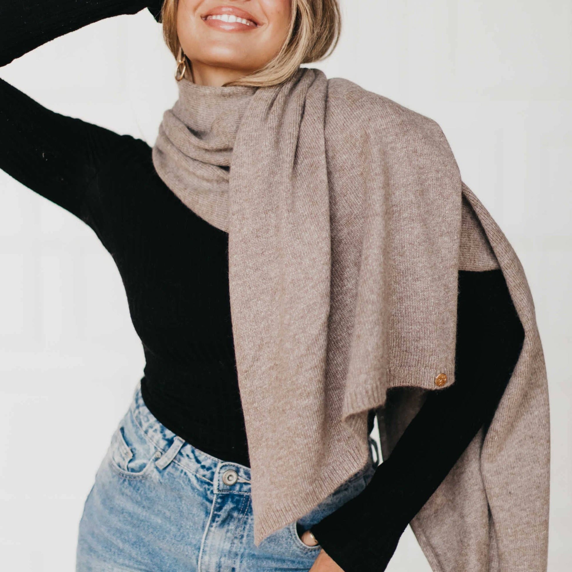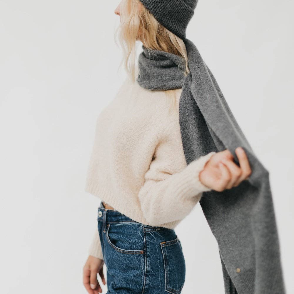 The ultimate in luxury. The Cassidy Cashmere Wrap and Beanie Duo is made from the same luxurious yarn to keep you warm, and feeling lush in the classic style. A scarf and hat combo that will stand the test of time for both style and quality while it completes your look from head to toe. Use as a wrap scarf, or bring with on your travels as an extra layer for chilly flights, nights and AC. Cashmere Blend.