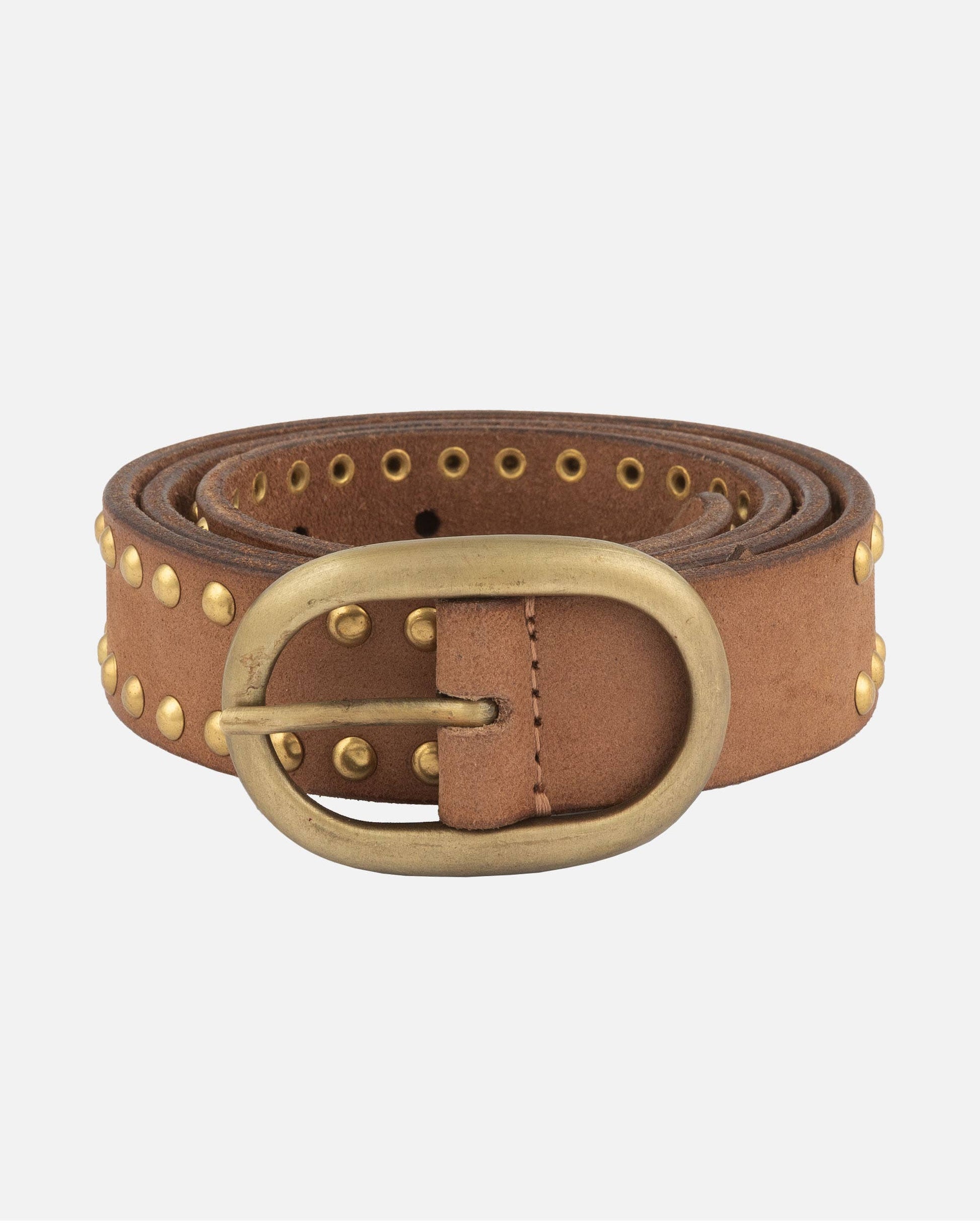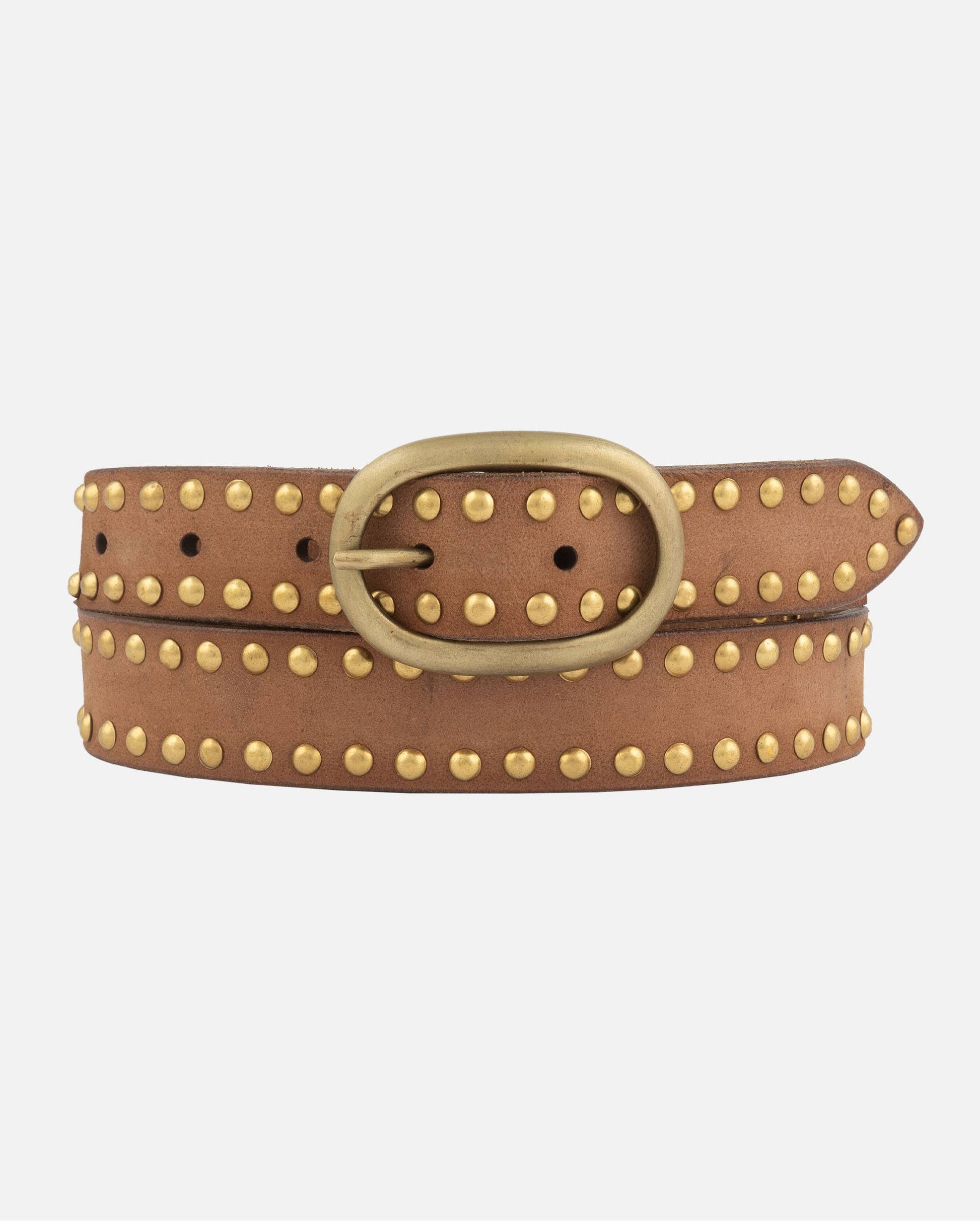 Crafted from high-quality leather, this belt features striking gold-tone studs and an antique brass oval buckle for a unique, edgy look. Designed for durability and style, it's perfect for adding a touch of character to jeans, skirts, or dresses. Whether you're aiming for a casual-chic vibe or something more daring, this studded belt is the ultimate accessory to elevate your outfit with effortless flair. PRODUCT DETAILS Width: 1.18" Material: Vegetable Tanned Premium Leather Buckle: Antique Gold