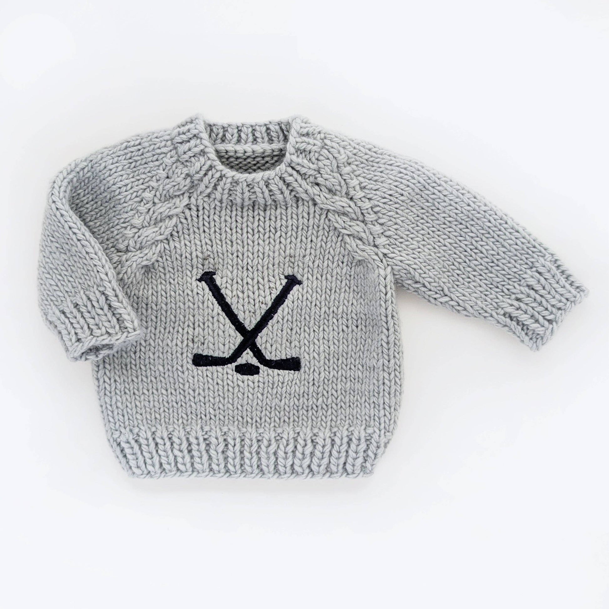 This Baby & Toddler Hockey Sweater in Ice Grey yarn and embroidered with Navy Blue hockey sticks and a puck is a must-have for any hockey fan. Complete the look with our Hockey Beanie and show off your team pride in a playful, icy-cool way!