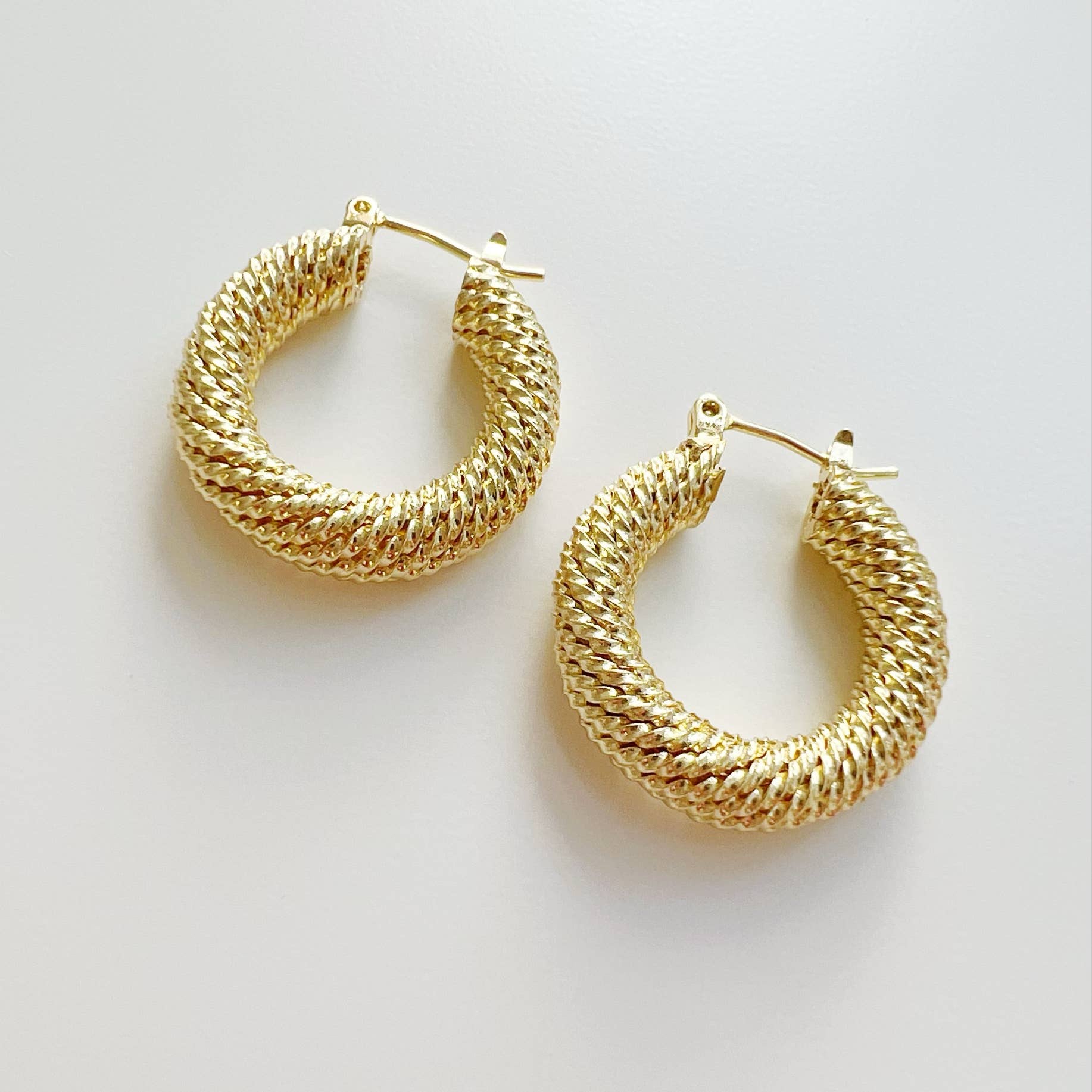 High quality 14k gold filled textured hollow hoops. Lightweight. Size: 25mm Hinge backing Lead & nickel free Hypoallergenic