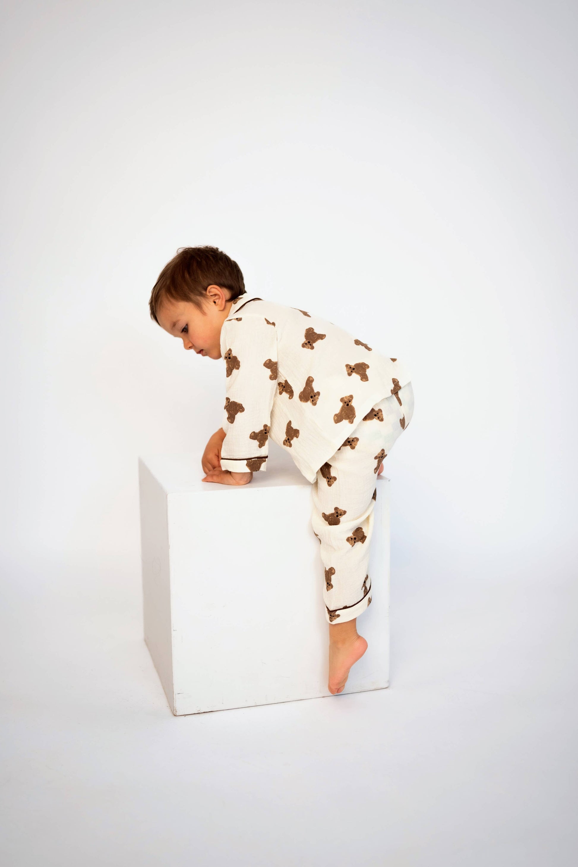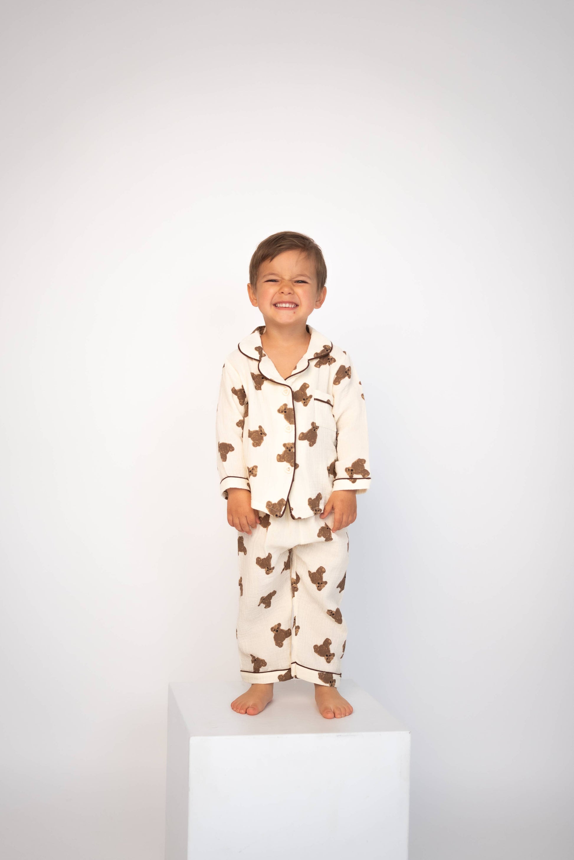 Experience ultimate comfort and cuteness in our Teddy Pajama Set. With its neutral color, button-up design, and adorable teddy bear print, this precious pajama set is a must-have for any wardrobe.