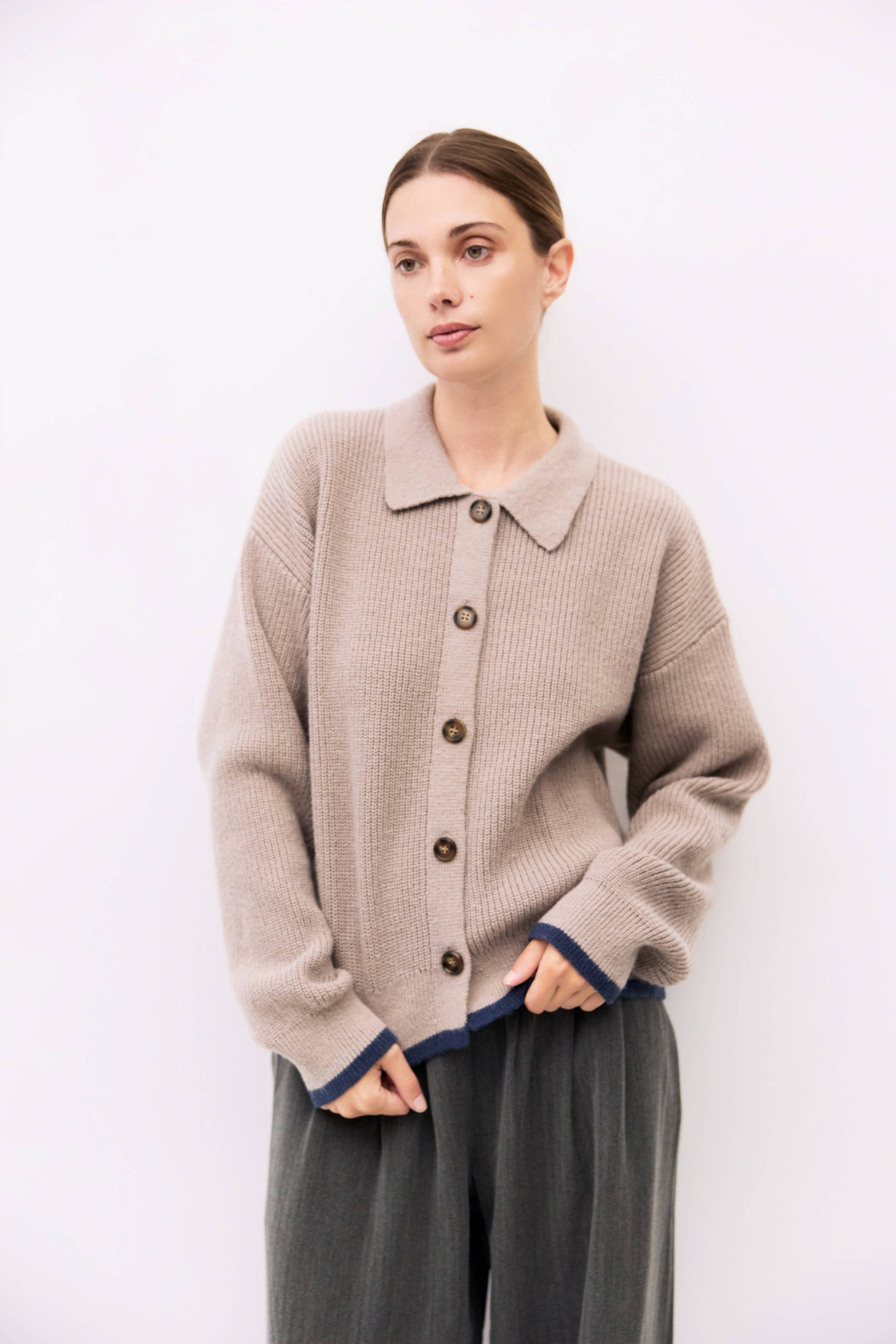 The Hans Cardigan features a collared neckline and front button closure for a classic look. Made from a midweight brushed knit, it has long sleeves and contrast stripes along the cuffs and hem for subtle detailing.